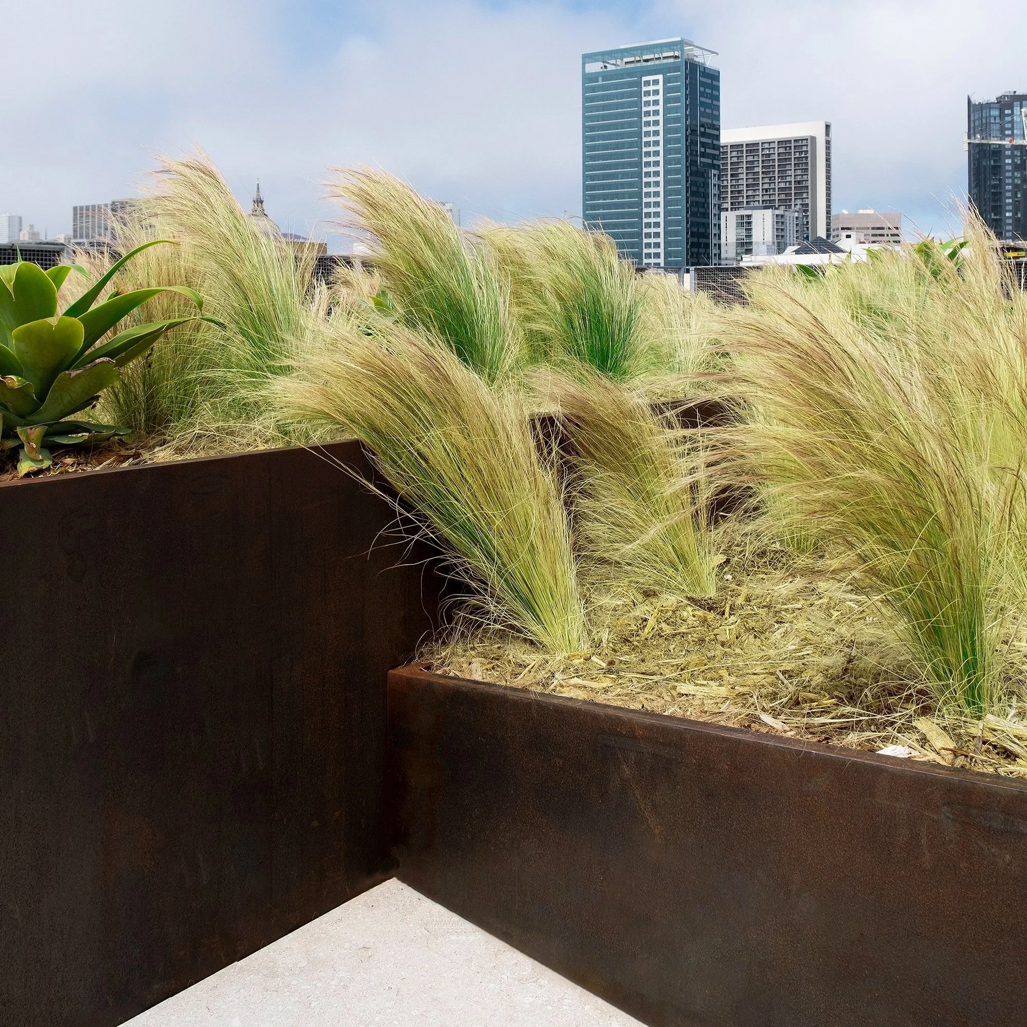 Custom modular planters, each slanted upward to the sky, creates the same repetition and rhythm that echoes the sculptural quality of the façade.