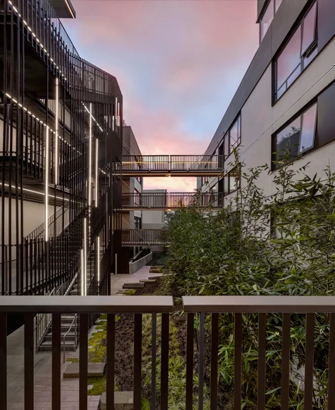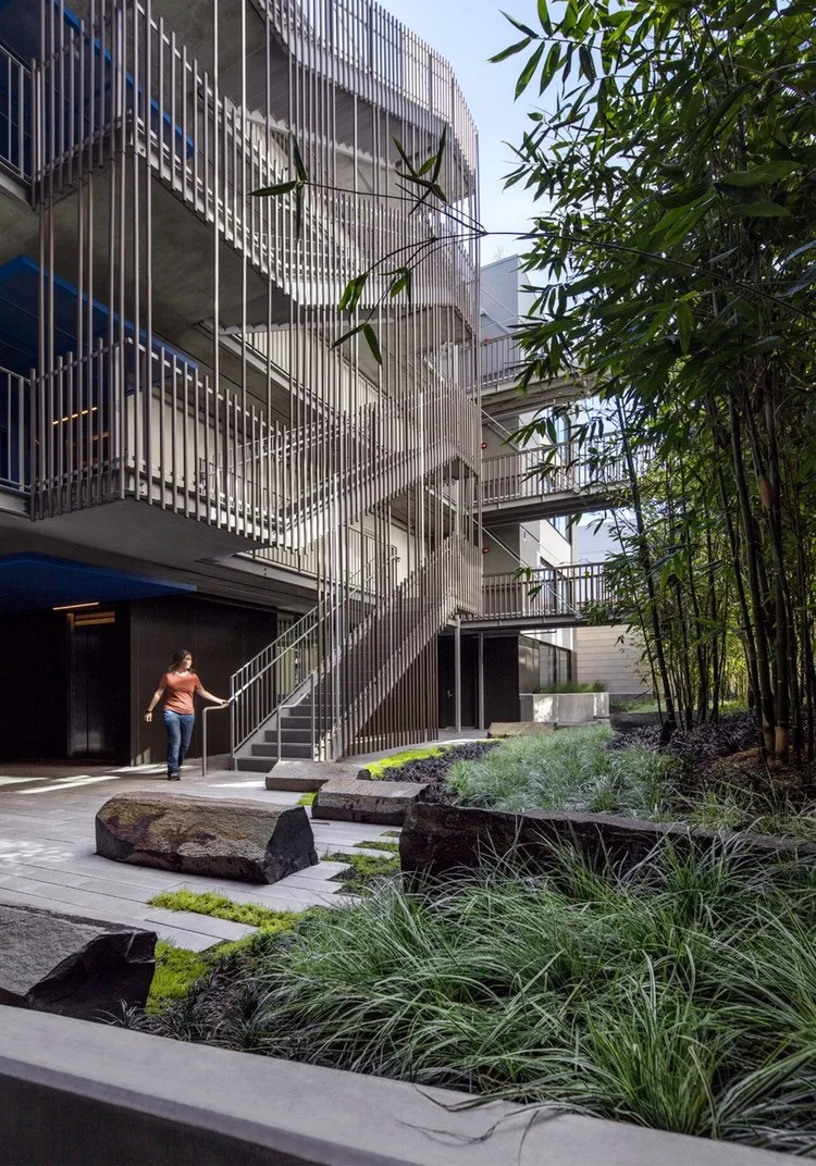 MFLA with Fougeron Architects designed this mid-rise with an internalized courtyard. A towering grove of timber bamboo scales the project and provides visual screening between units. Upper level terraces and common roof gardens were also developed. 400 Grove is the second completed project in our “Hayes Collection”.