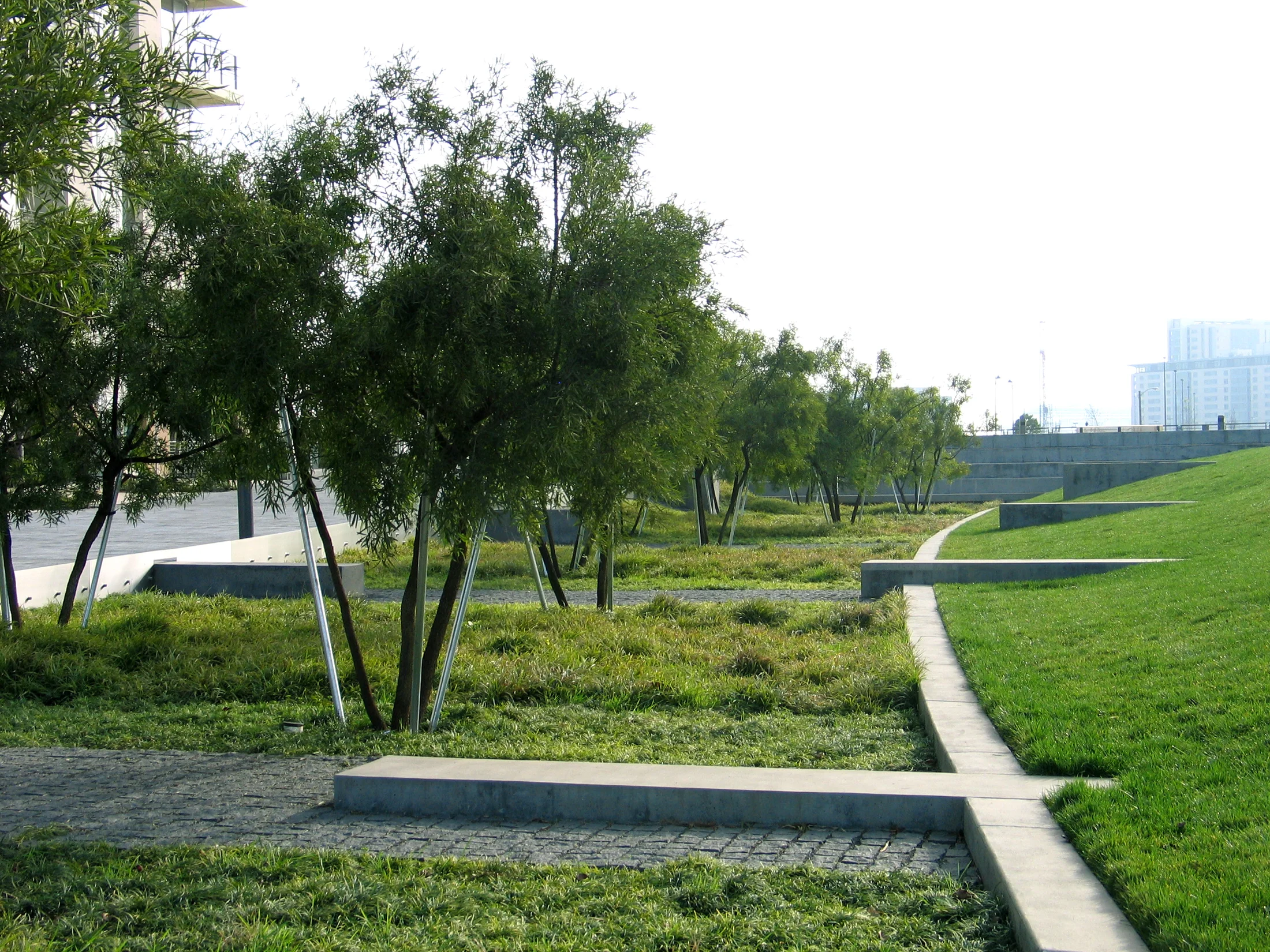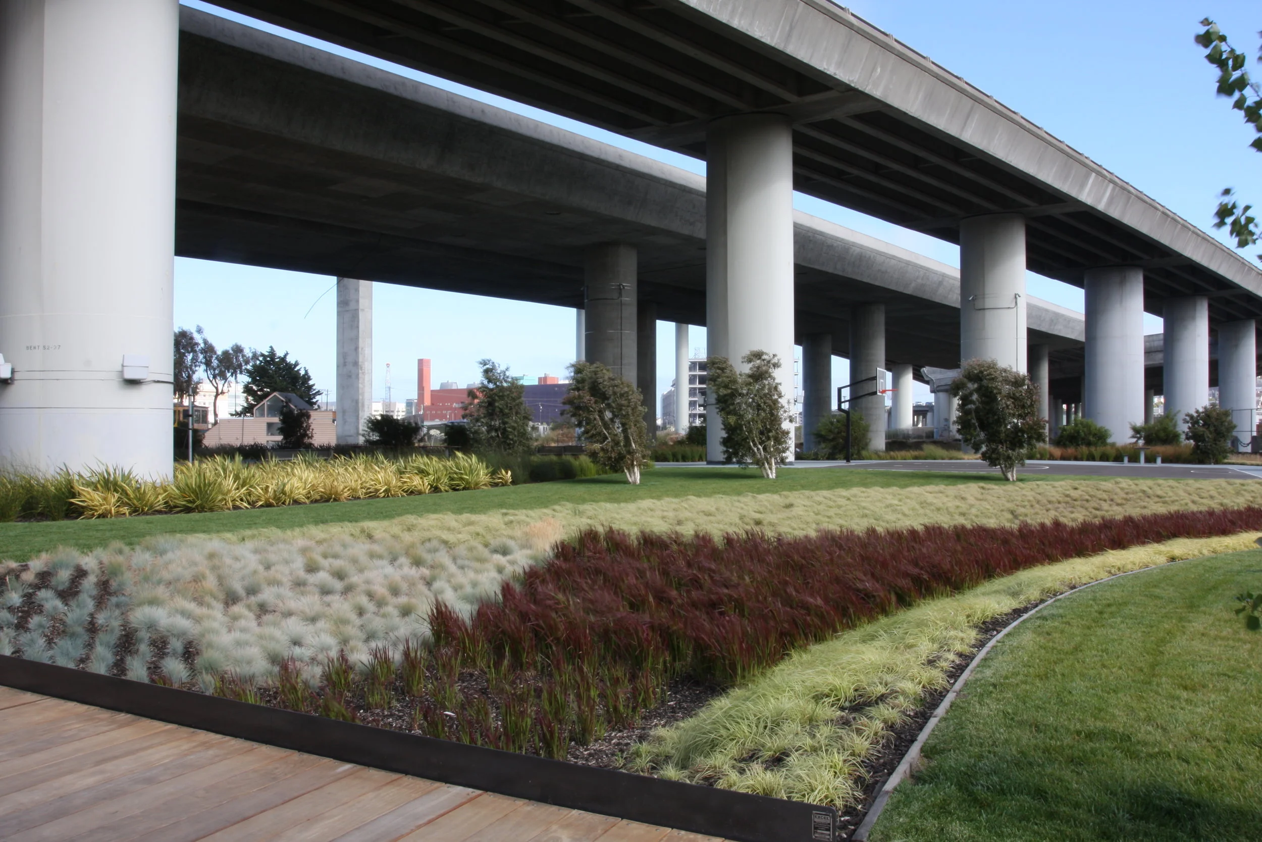 Inheriting a contaminated brownfield, MFLA developed a linear park with a series of plazas and overlook insertions and generous 20’ esplanade that follows the length of the Mission Creek Channel and includes the Sports Park, developed underneath existing freeway ramp structures and columns supports. The park’s estuarine banks, once urban dumping grounds, have been re-engineered and stabilized with wetland plantings and are now a thriving habitat for waterfowl. The park design was driven by both physical and temporal context.