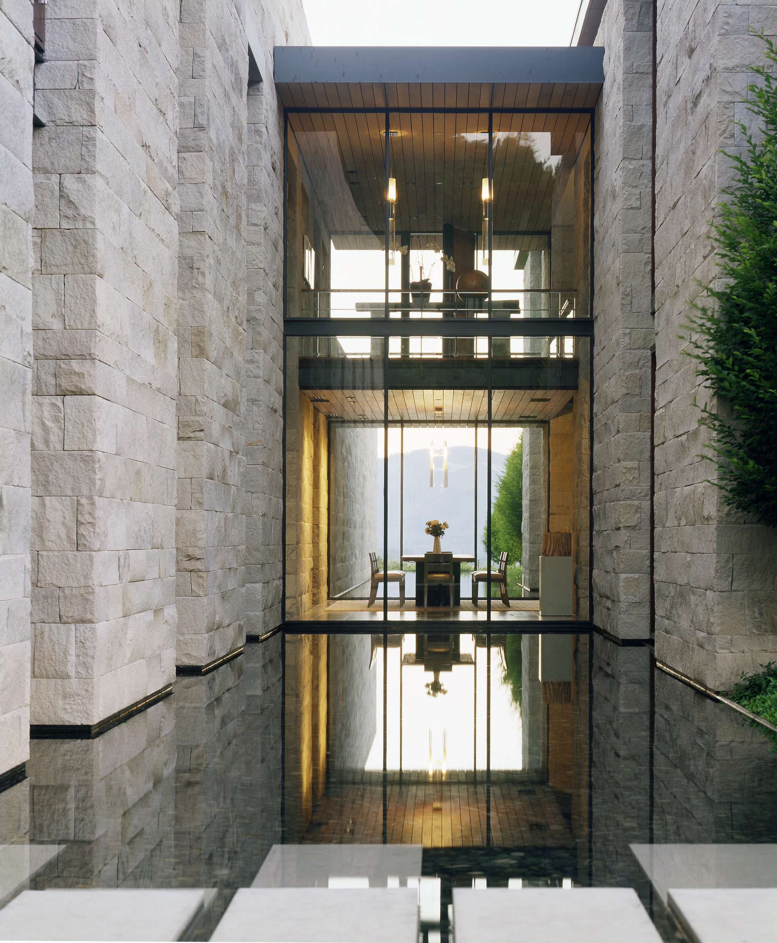 A rectilinear reflecting pool travels along the entire length of the house, modulating climate and blurring the boundaries between landscape and architecture.
